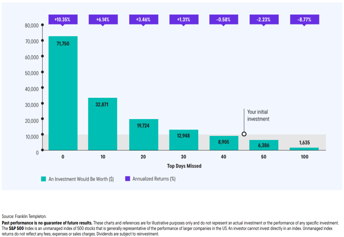 Additionally, research shows us that if one sits out and misses just 10 of the best days in the market, returns are severely hampered and can have a lasting impact on retirement goals.