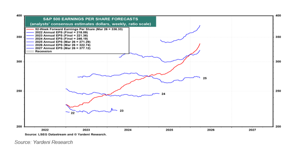 Despite all the noise, Wall Street analysts have continued to raise their corporate earnings forecasts for both 2026 and 2027. The slope of earnings estimates for S&P 500 companies is still trending higher — with double-digit earnings growth still the base case for the year. History is consistent on this point: stock prices tend to follow earnings over time, and the fact that analyst estimates have held firm through this period of geopolitical turbulence is a meaningful data point.
