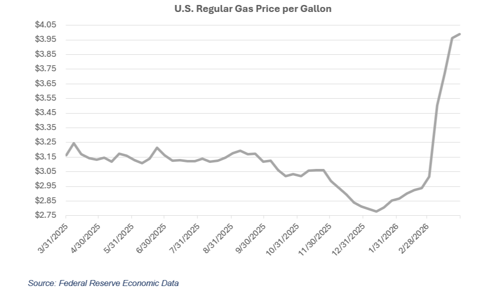 The result was a rapid spike in global oil prices. U.S. WTI crude climbed to roughly $90–$100 per barrel, while international Brent crude reached the $110–$120 range. At the pump, Americans felt the impact directly — gas prices rose to close to $4 per gallon, up more than a dollar from the lows earlier in the year. Higher energy costs eat into consumer purchasing power and complicate the inflation picture for the Federal Reserve.