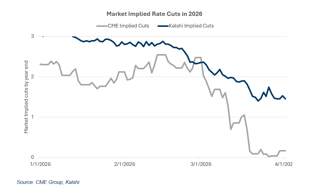Fed rate cut expectations, which had been pricing in two to three cuts entering the year, compressed sharply to zero to one following the conflict's escalation. The Fed held its stance at its most recent meeting, still projecting one cut for the year. That shift represents a meaningful change in the tailwind discussed at the start of 2026.