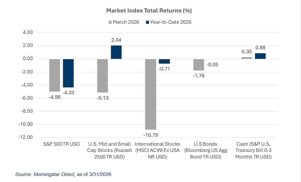 Stocks fell approximately 5% across most major U.S. categories in March. The S&P 500 finished the month down almost exactly 5%, and small and mid-cap stocks declined by a similar amount. International stocks bore the brunt of the selloff, falling roughly 11% for the month — a reflection of Europe and Asia's significantly greater dependence on Middle Eastern energy and Strait of Hormuz shipping lanes. Bonds declined modestly, down around 2%, but once again demonstrated their value as a buffer, outperforming equities by a meaningful margin. Cash remained positive.
