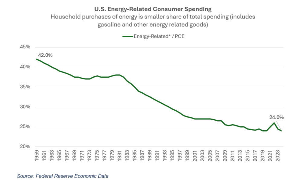 The selloff, while real, was far less severe than comparable energy shocks of the past — and for good reason. The United States now produces approximately 20 million barrels of oil per day, nearly double the output of second-place Saudi Arabia, making it the world's largest oil producer. Beyond production, American households have dramatically reduced their energy footprint — energy-related spending as a share of household budgets has fallen from roughly 42% in the mid-20th century to around 24% today. These two factors together help explain why the stock market found a floor, with the S&P 500 pulling back roughly 9–10% from its highs at the worst point rather than entering a deeper decline.