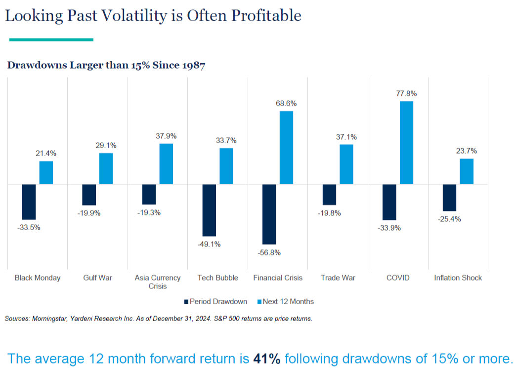 Market volatility can stir up unease, but we want to share a perspective that underscores the value of staying committed to your long-term financial strategy. History offers a powerful insight: since 1987, after market drawdowns of 15% or more, the average 12-month forward return has been an impressive 41% (see chart below). This isn’t just a statistic—it’s a reminder that tough moments often lay the groundwork for significant opportunities. Let’s explore why sticking to your diversified, long-term plan may likely be the smartest path forward.