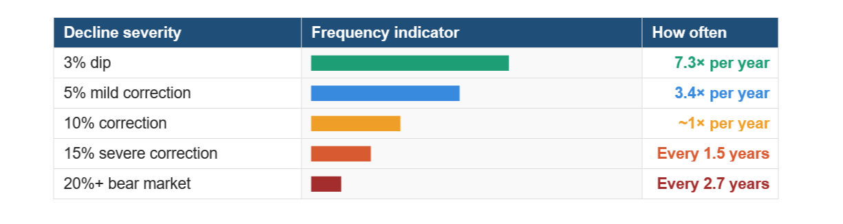 What we’re experiencing right now isn’t an anomaly — it’s a normal part of investing. The table below shows just how frequently market declines of every size have occurred historically.3