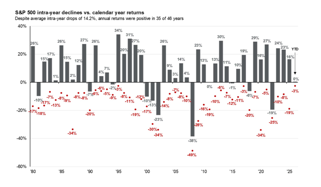 The chart below covers 46 years of market history — crashes, recessions, wars, and pandemics. The red dots mark the scariest intra-year drops. The gray bars are what actually happened by year-end. Despite average intra-year drops of 14.2%, the market finished positive in 35 of those 46 years.