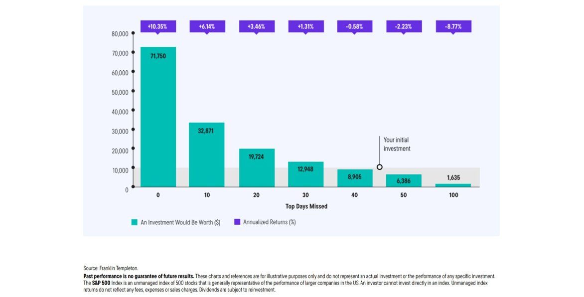 The chart below makes the stakes concrete. A $10,000 investment left fully invested over time grew to $71,750 — a +10.35% annualized return. Miss just the 10 best days? You’re left with $32,871. Miss 50 of them and you’ve actually lost money on your original investment.4